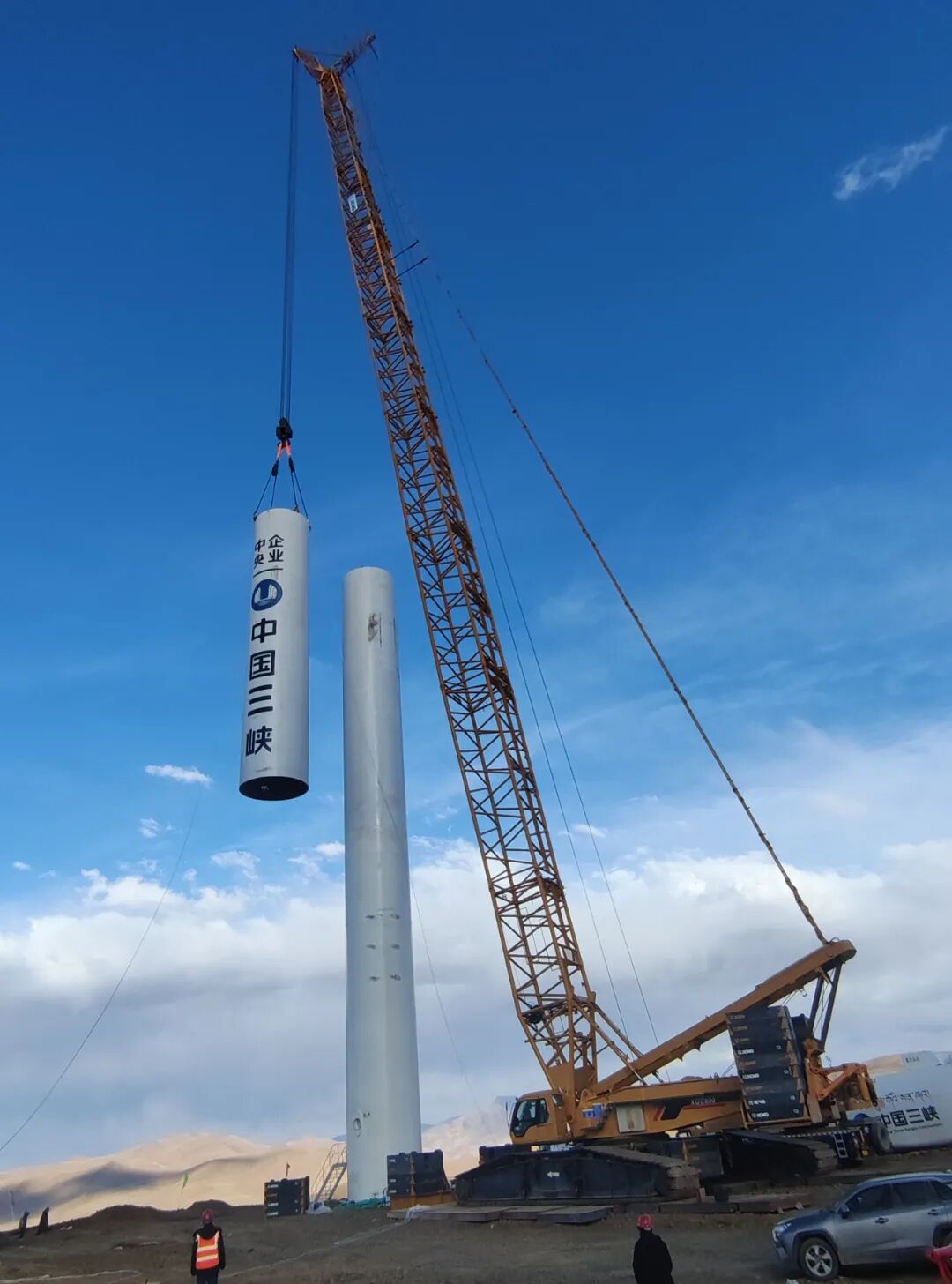 施工人员介绍,刚刚运输过来的风机塔筒,路上耗时两个多月。这些零部件从运输到安装,需要克服当地复杂地理环境、恶劣气候条件等诸多考验。值得一提的是,哲古风电场一期的成功建设填补了超高海拔地区风力发电开发建设的行业空白,二期工程在此基础上在也吸收了不少成功经验。